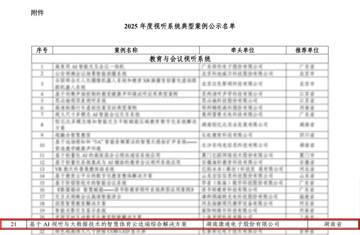 全国仅有86项案例获此殊荣,其中,湖南康通电子股份有限公司凭借“基于AI视听与大数据技术的智慧体育云边端综合解决方案”成功跻身其中,成为教育视听系统领域获国家认可的创新标杆。